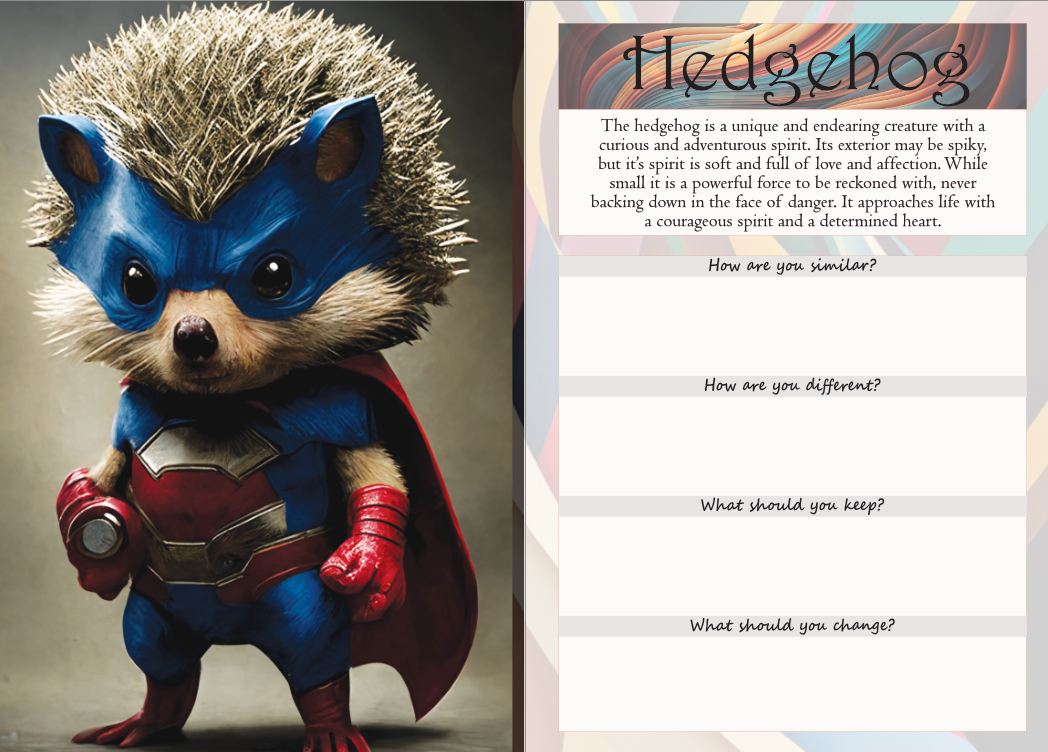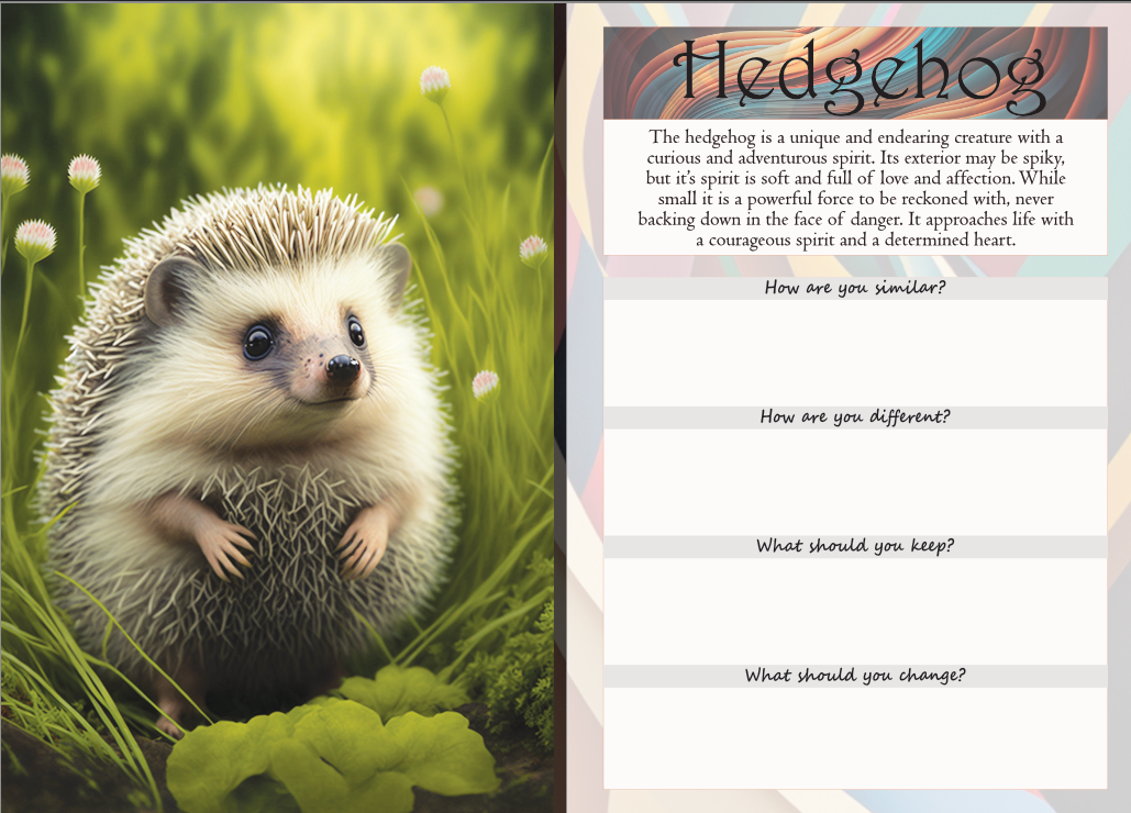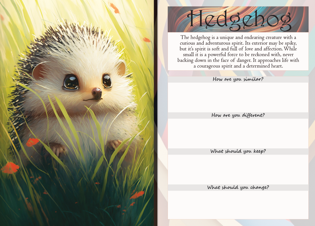 There are 30 full-color original animal illustrations. Each day presents you with the full-color picture along with a short emotive description. On each page there are four introspective self-coaching questions asking you how you are similar and different to the animal’s description. Along with asking what you would want to keep for yourself, and what you would like to change about yourself from your introspection of the presented emotive description.